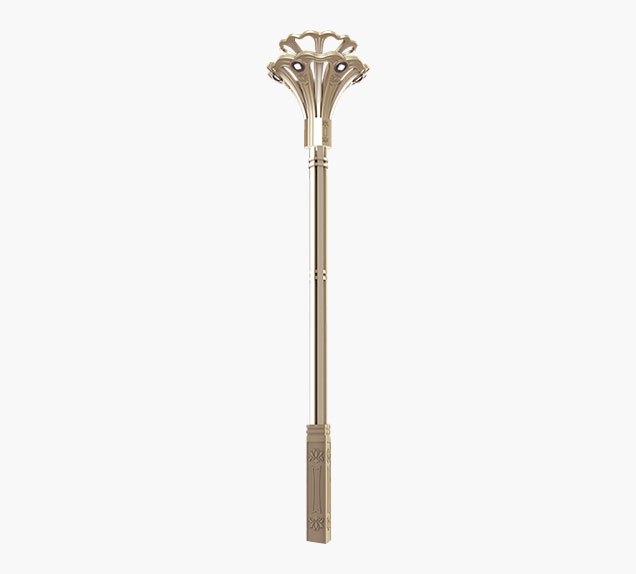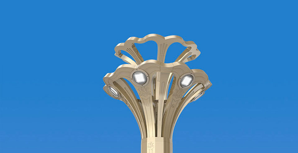 设计以抽象化的牡丹花构成灯具主体,花冠硕大,重瓣层叠结构,花后魏紫装饰灯光形成绚丽的景观照明效果,结合现代科技元素,整灯端庄大气,智慧时尚,突显出牡丹花雍容大度,富丽高贵的品格。